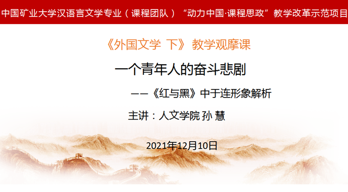 孙慧老师依托其所主持的我校首批国家级一流课程《外国文学 下》(混合式),以落实学科核心素养为目的,培养全面发展的学生,打造高效智慧的课程思政课堂,在超星“一平三端”智慧教学系统支持下,用话剧演绎翻转文学课堂,使课程思政春风化雨,润物无声。该观摩课是校级“动力中国·课程思政”教学研究示范项目的阶段性成果,其以“一个青年人的奋斗悲剧”为主题,以习近平总书记对青年人奋斗的寄语作课程导入,创设情境,巧妙将任务驱动法、合作探究法、教授法、沉浸式教学方法等融为一体,打造了一个“有智-有情-有心--有用”的文学课程的思政课堂。