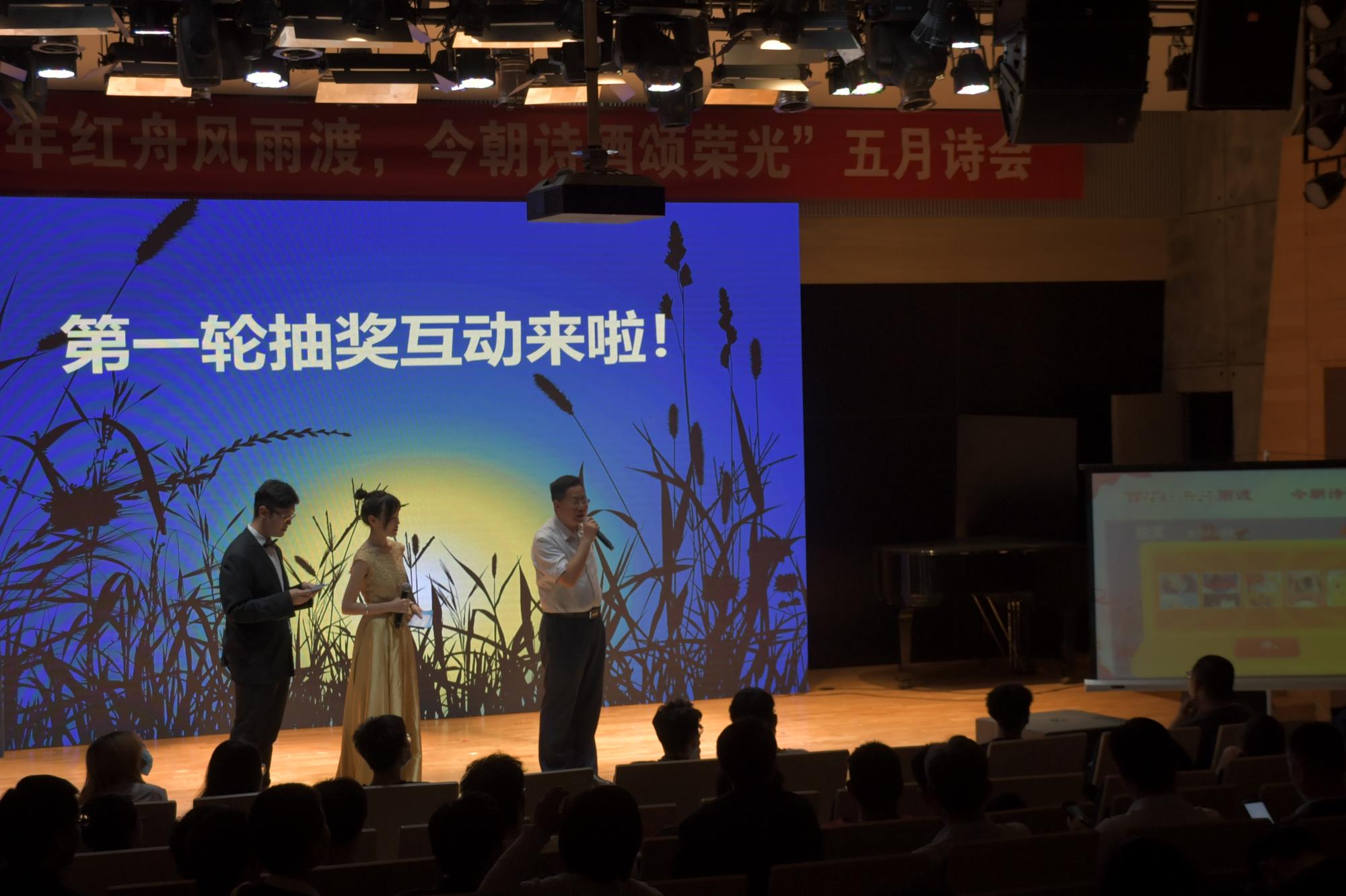 党委书记方跃平、校团委书记谢发国、校党委学生工作部部长冯震先后为现场同学抽取了诗会互动奖品。为进一步鼓励同学从党史中汲取奋进的力量,本次诗会还设置了党史问答互动环节。同学们踊跃参与、积极答题,充分展现出了矿大学子学史明理、学史增信、学史崇德、学史力行的良好状态。