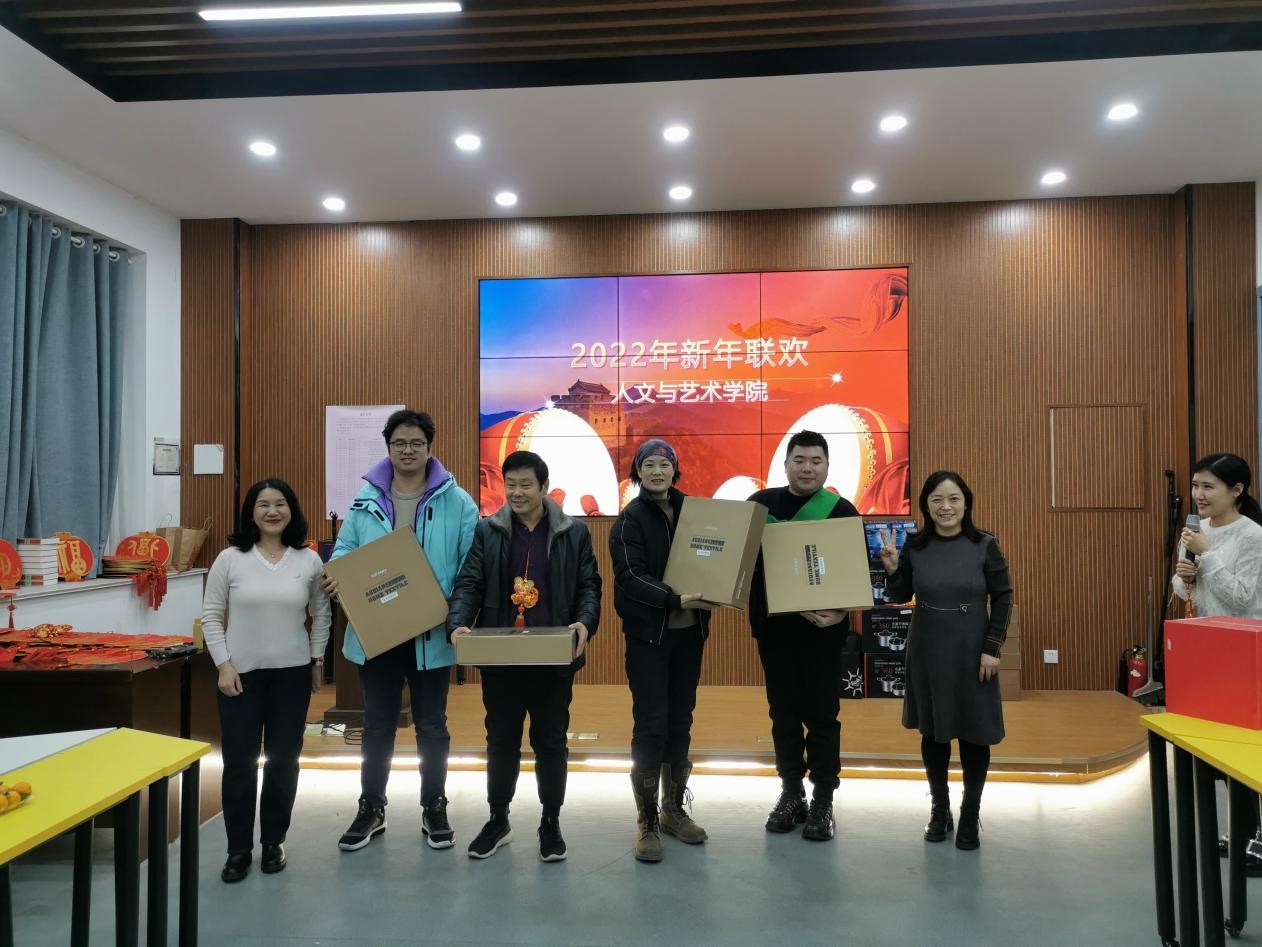 教职工新年联欢会第二阶段的娱乐环节,由董德、郑一萌两位老师主持。首先由机关支部带来精彩的舞蹈《蓝屏晚钟》,获得大家热烈掌声;接下来,广电系王青和任老师的女儿登场朗诵《月光下的中国》,尽现家国情怀;美术系王磊、马平、刘艺超三位老师将自己参加学校“辉煌百年、同心筑梦”画展的作品带到了联欢现场,并为大家进行了详尽地讲解,给联欢带来了高雅艺术氛围。随后,刘艺超老师弹唱曲目《Happy New Year》和《喜欢你》,李广文老师演唱歌曲《渴望》,杨思留、魏凤娥老师合唱《敖包相会》,刘振老师独唱歌曲《等待》,给大家带来了无穷的艺术享受。高淮生老师特意为联欢会带来书法虎年日历, 陈学利老师在现场泼墨挥毫创作福卡,为联欢带来浓郁的新春气息。联欢会以董德老师的一首《爱的代价》为结尾,整个活动期间精彩纷呈,洋溢着欢快的节日氛围,老师们的精彩节目和优秀才艺获得了在场观众的阵阵喝彩与热烈掌声,充满了温馨与祥和。此外,学院还为属虎的老师们赠送了本命年的小礼品,表达全体师生员工的美好祝愿与对新年到来的憧憬;徐州农商银行为活动提供了精美的奖品,表达了对老师们浓浓的节日祝福。