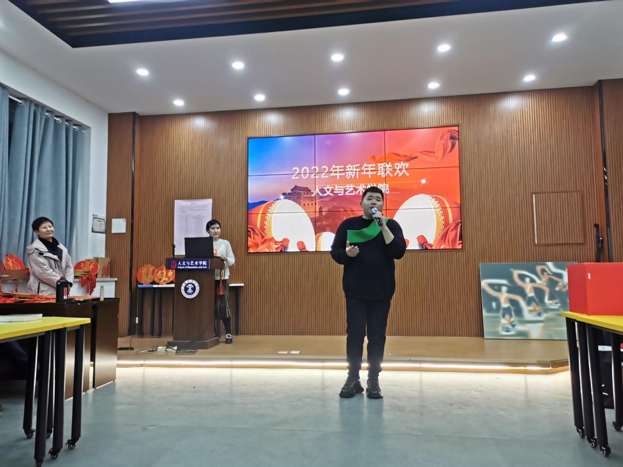 在文A111举办教职工新年联欢会,全体教职工和部分家属济济一堂,喜迎元旦佳节。