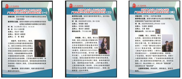 活动期间,广电专业分别围绕“新闻与传播专业学生新媒体技术实际运用能力培养路径与培养模式分析与探讨”“如何打通科研/教学/育人,设计混合式新媒体专业课?”和“新闻与传播专业毕业设计教学模式 & 新媒体视听产品创作能力提升路径”等教材教法、课程建设和实践教学主题,邀请江苏师范大学传媒与影视学院原院长刘永宁教授,上海交通大学媒体与传播学院副院长李晓静教授和深圳大学传播学院副院长王建磊副教授,分三期开设了《新文科背景下新闻与传播专业学位点规划与建设漫谈》、《如何打通科研/教学/育人,设计混合式新媒体专业课?》和《元宇宙:一场开放式想象》等系列讲座,并就相关问题进行座谈和研讨。