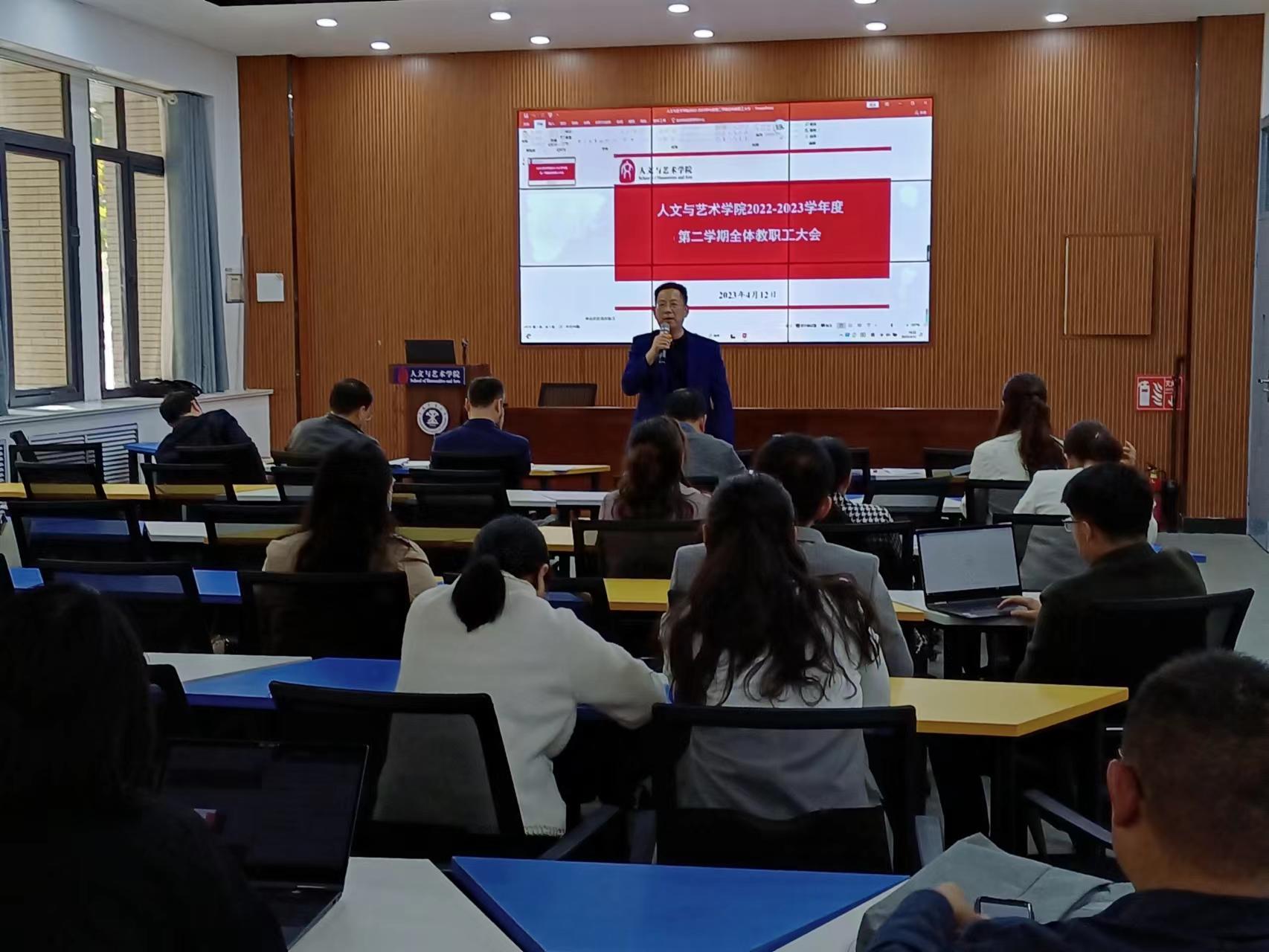 方跃平书记在主持会议时指出,学校对学院的发展高度重视。最近一段时间以来,宋学锋校长专程安排一个下午的时间与学院各系部教职工代表座谈,听取意见和建议;教务部、人文社科处、发展规划处等单位相关负责人先后来学院调研座谈,了解学院改革与事业发展情况,调度解决相关问题。蔡世华副书记在本学期开学初出席学院处级领导干部民主生活会点评并指导工作,对学院党政班子提出了五点明确要求,体现了学校党委对人文学院的重视与支持。方跃平书记还通报了学院即将接受校党委常规巡察工作相关情况的安排,表示学院将全力以赴配合巡察要求,自觉接受巡察监督,切实加强工作整改。他希望学院全体教职工在党的二十大精神指引下,提振精神、苦练内功,在学校的关心和指导下,激活动力、破解难题,努力推进学院的改革与事业发展再上新台阶。