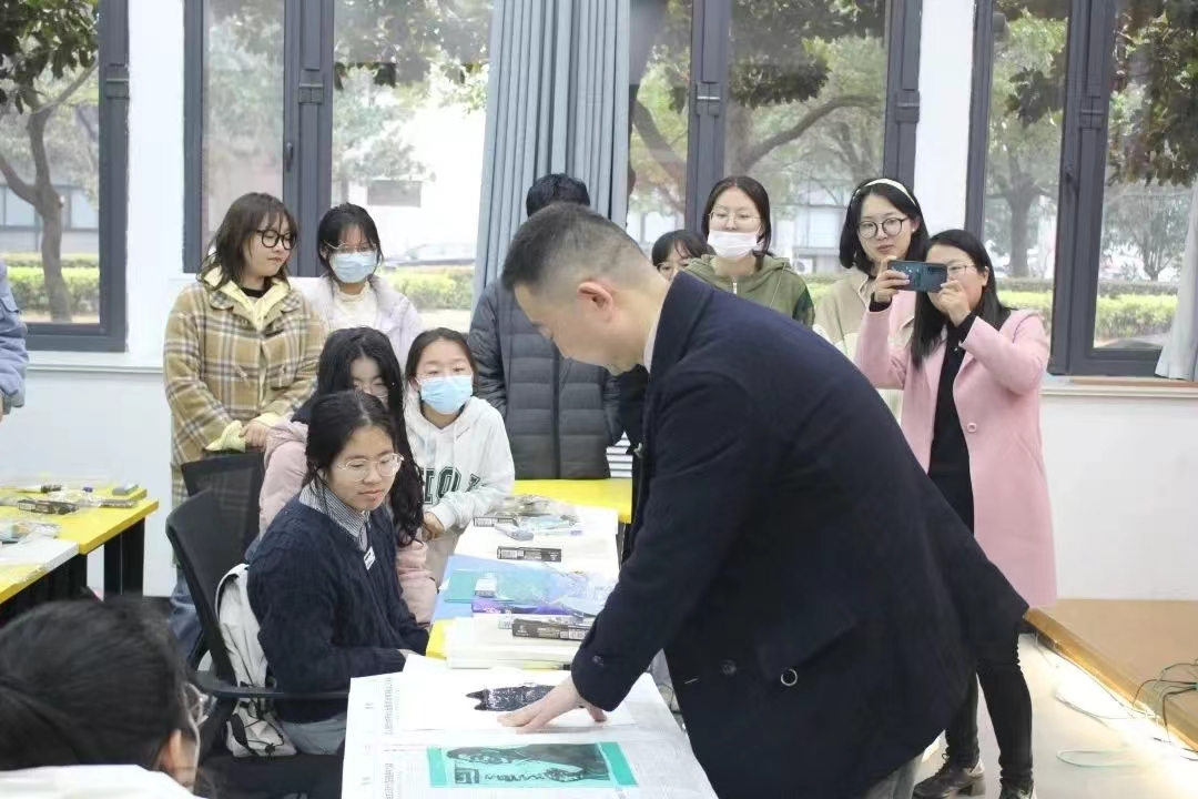 王磊老师向同学们介绍了木刻版画的“前世今生”,我国复制木刻版画已有上千年历史,新兴木刻版画则起自20世纪30年代,经鲁迅提倡,成为一股崭新的革命美术创作潮流。在抗战洪流中,艺术家们将版画艺术作为战斗的武器,在思想教育引导方面发挥了巨大的作用。王磊老师带领大家赏鉴了《“九一八”日军侵占沈阳城》《到前线去》《彭德怀将军在抗日最前线》等经典木刻版画,体味中国现实主义艺术创作“扎根人民、扎根生活”矢志不渝的追求和源源不断的艺术力量。