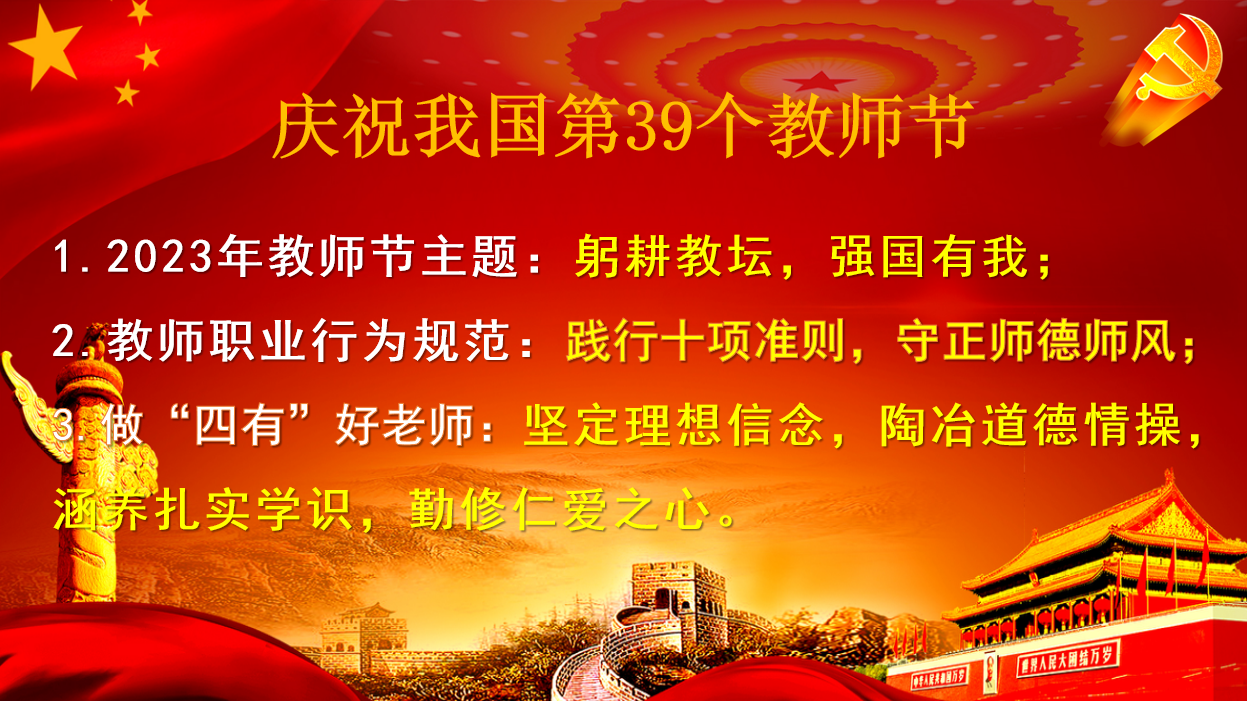 9月4日开始,按照上级党组织的部署要求,学院在网站开辟“庆祝我国第39个教师节”专栏,宣传2023年教师节主题“躬耕教坛,强国有我”;强调“践行十项准则,守正师德师风”的教师职业行为规范要求;提醒广大教师做“坚定理想信念,陶冶道德情操,涵养扎实学识,勤修仁爱之心”的“四有”好老师。