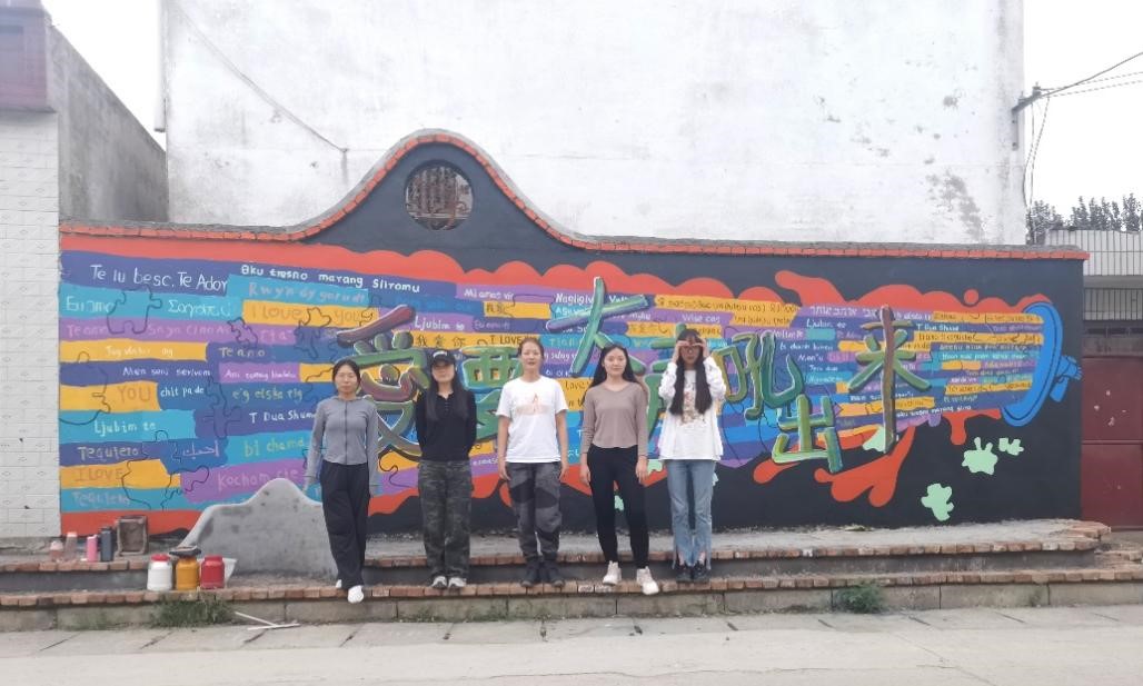 马平副教授带领孙晓娜、李雨薇、赵倩男、谷丽娜等四位美术硕士专业学位研究生,奔赴安徽宿州萧县许岗村进行乡村公共艺术实践活动,四位同学在8天假期中进行雕塑涂饰和墙绘实践。马平老师带领学生考察村貌、走访村民,结合村里的不同景色和风貌进行环境观察讲解,与村民交流乡村艺术建设话题,接受许岗村艺术乡建项目主持颜岸老师的指导,进一步理解项目建设主旨及其方向。学生进行雕塑表面涂饰,完成两幅以网络流行用语为主体的平面作品以及墙绘作品《爱要大声吼出来》,选择世界各国不同语言的“我爱你”表达方式,色彩文字层层叠加,最后在表面涂鸦“爱要大声吼出来”七字。