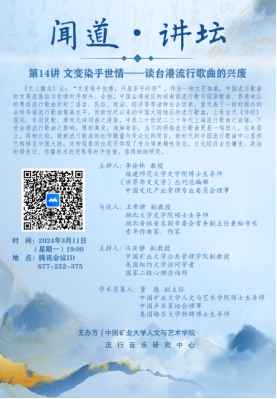 流行音乐研究中心主办的“闻道”系列讲坛第14讲顺利开展,本期的主题为“文变染乎世情——谈中国台港流行歌曲的兴废”。讲坛由福建师范大学文学院博士生导师李诠林教授为主讲人,湖北大学文学院硕士生导师王希翀副教授为与谈人,无码av