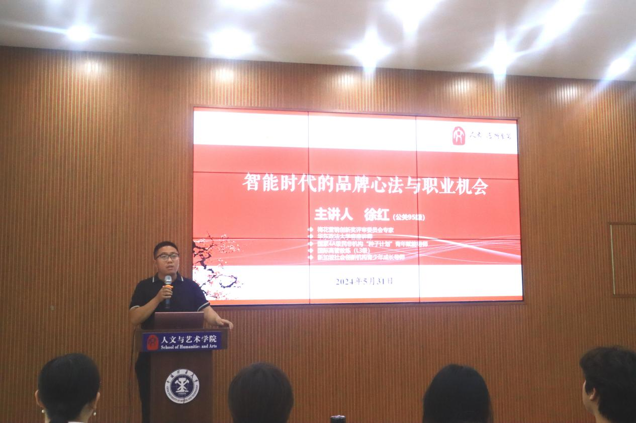 邀请95级校友徐红举办题为“智能时代的品牌心法与职业机会”的讲座。学院党委副书记刘宁出席讲座,并为徐红颁发“大学生生涯导师”证书,2023级专职辅导员苏辉主持讲座,学院2023级部分本科生参加讲座。