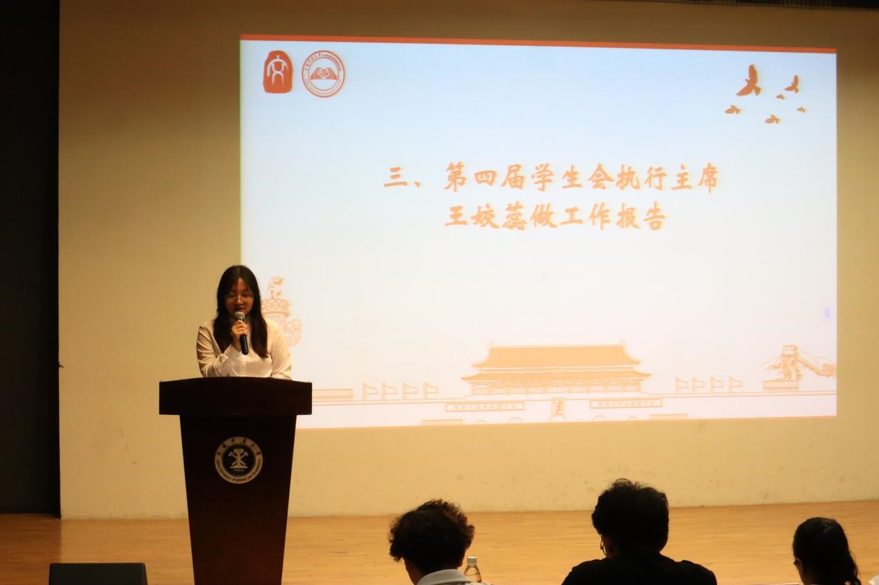 学院学生会执行主席王姣蕊做学院学生会2023-2024年度工作总结报告。她系统总结了上一年度学生会的主要工作以及取得的成就,从加强队伍建设、夯实工作制度、推动制度创新、加强思想建设四个方面阐述如何进一步完善学生工作,并表示在今后的学生工作中,学生会将秉持以人为本、汇聚青春的工作宗旨,坚持在院团委的指导下开展工作,全心全意为同学们服务。