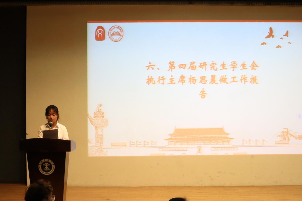 学院研究生会执行主席杨思晨做研究生会2023-2024年度工作报告。她介绍了研会具体机构设置与工作分配,展示了过去一年中研究生会的工作成果及其不足。她表示研会将继续在院党委的正确领导下与院团委的悉心教导下,团结带领全体研究生紧紧围绕着学校与学院的改革发展大局,总结、改进、发展、创新研究生会工作,将端正态度、注意细节、乐于奉献的工作作风贯彻到底。