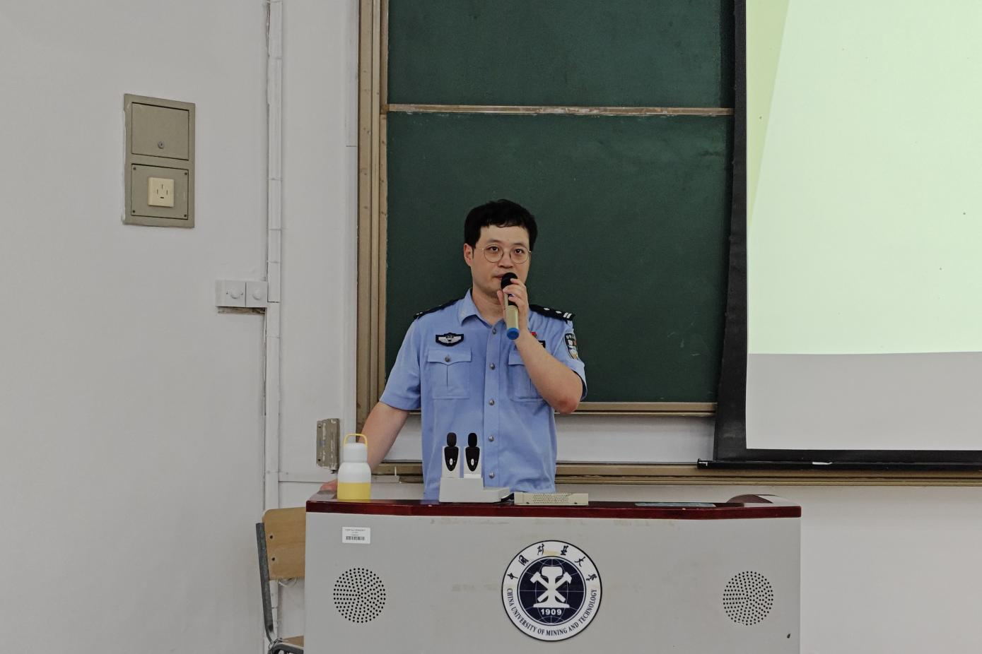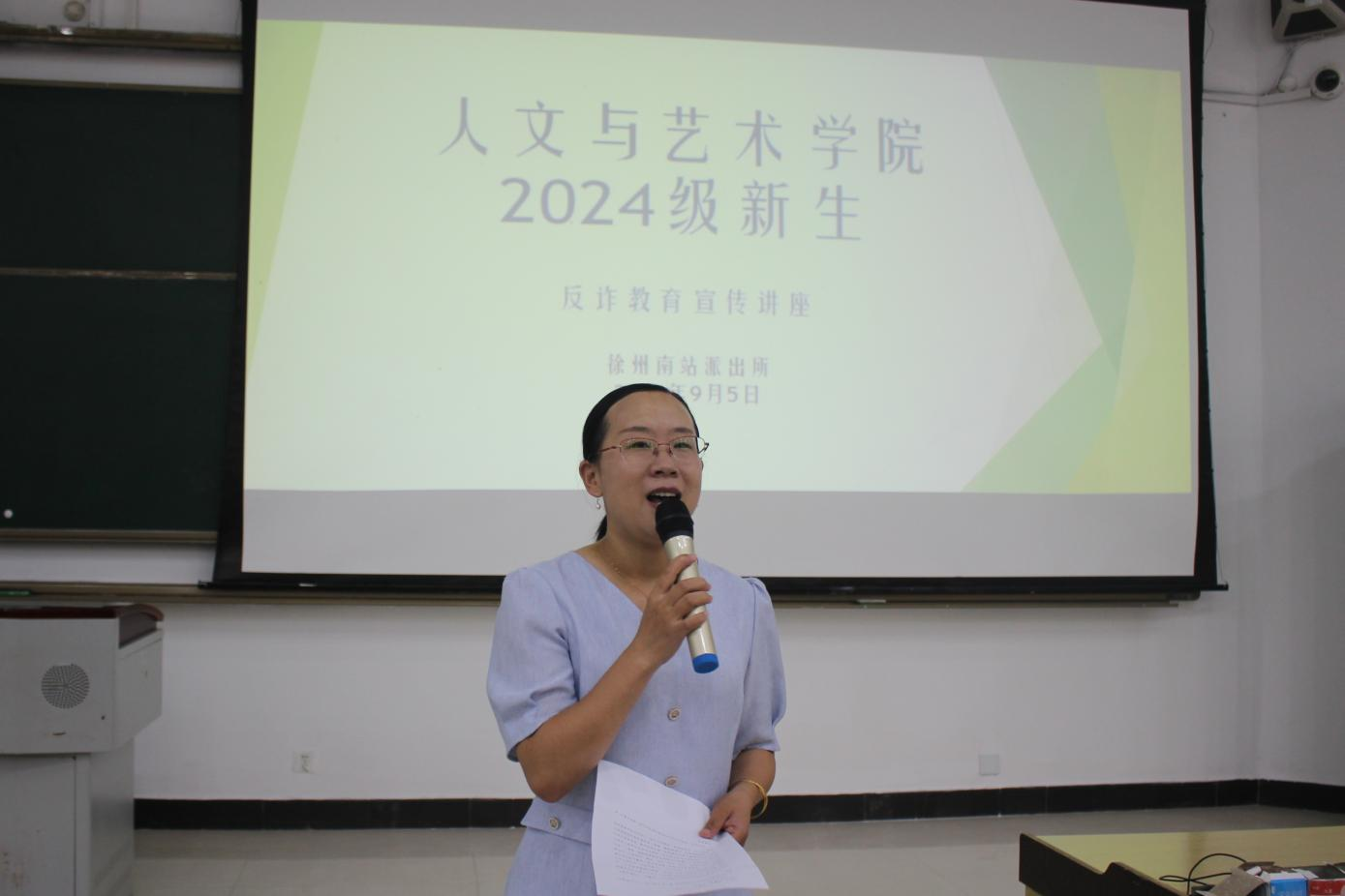 在博二C102室开展2024级新生反诈宣传讲座。活动由学院党委副书记刘宁主持,徐州南站派出所祁中誉副所长主讲。学院2024级全体新生参与活动。