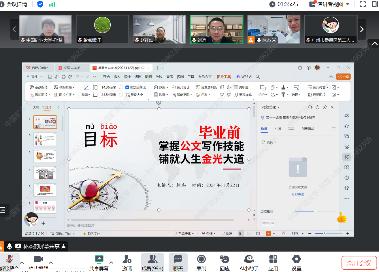 林杰老师首先通过“你究竟想拥有什么样的职业生涯?”这一开放性的问题,引导大家思考“如何把命运的钥匙握紧在自己手里”,他从“公文与学习生活和工作的关系”“公文在职业生涯中的重要作用”“养成与公众不同的公文写作思维”“要持续锤炼公文写作基本技能”“公文写作高手要具备哪些素质”等五个方面,深入浅出地讲解了“如何提升公文写作技能”。他结合自身工作实际,分享了他多年来的写作心得与技巧,形象讲解了公文写作技能提升的策略。谈到如何养成公文写作思维时,他认为作为当代大学生,应该在公文写作过程中,首先注意“政治站位”,一定要有过硬的政治素质,才能准确理解党的路线、方针、政策,确保公文内容符合党和国家的要求。此外,还应该注意“思维站位要全面”、“群众站位守初心”等,明确应用写作能力提升的重要性,引起了学生们的广泛共鸣。