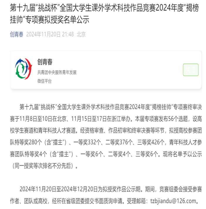 据悉,本届挑战杯的“揭榜挂帅”专项赛瞄准社会重大课题及现实问题,以“政企发榜、竞争揭榜、开榜签约”的方式,通过“征榜—发榜—竞榜—评榜—夺榜”,组委会面向高校和社会广发“英雄帖”,共吸引2.7万余人参加,提交参赛作品6500余件,全国410余所高校和企业的1950余件作品入围终审决赛。历经文本评审、现场答辩等环节的激烈角逐,我校学子共收获17件国赛奖项,其中特等奖1件、一等奖2件、二等奖7件、三等奖7件,取得了该项赛事设立以来的最好成绩。