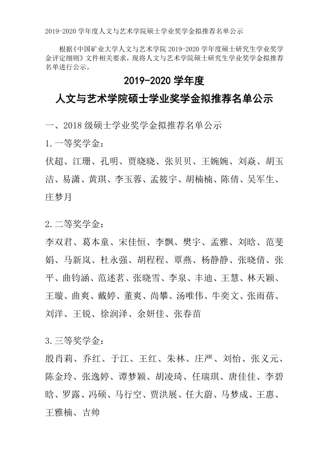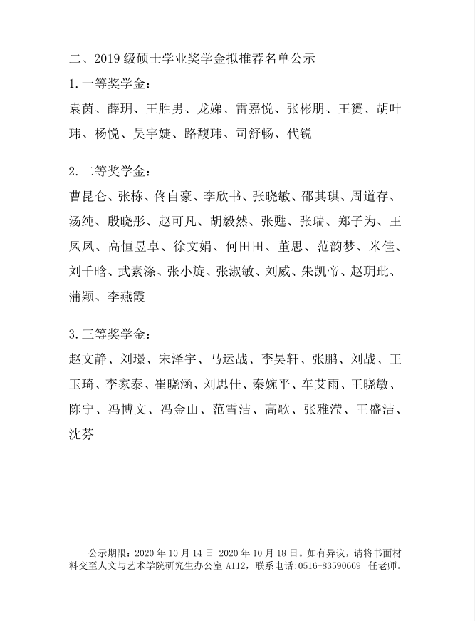 2019-2020学年度无码av 硕士学业奖学金拟推荐名单公示