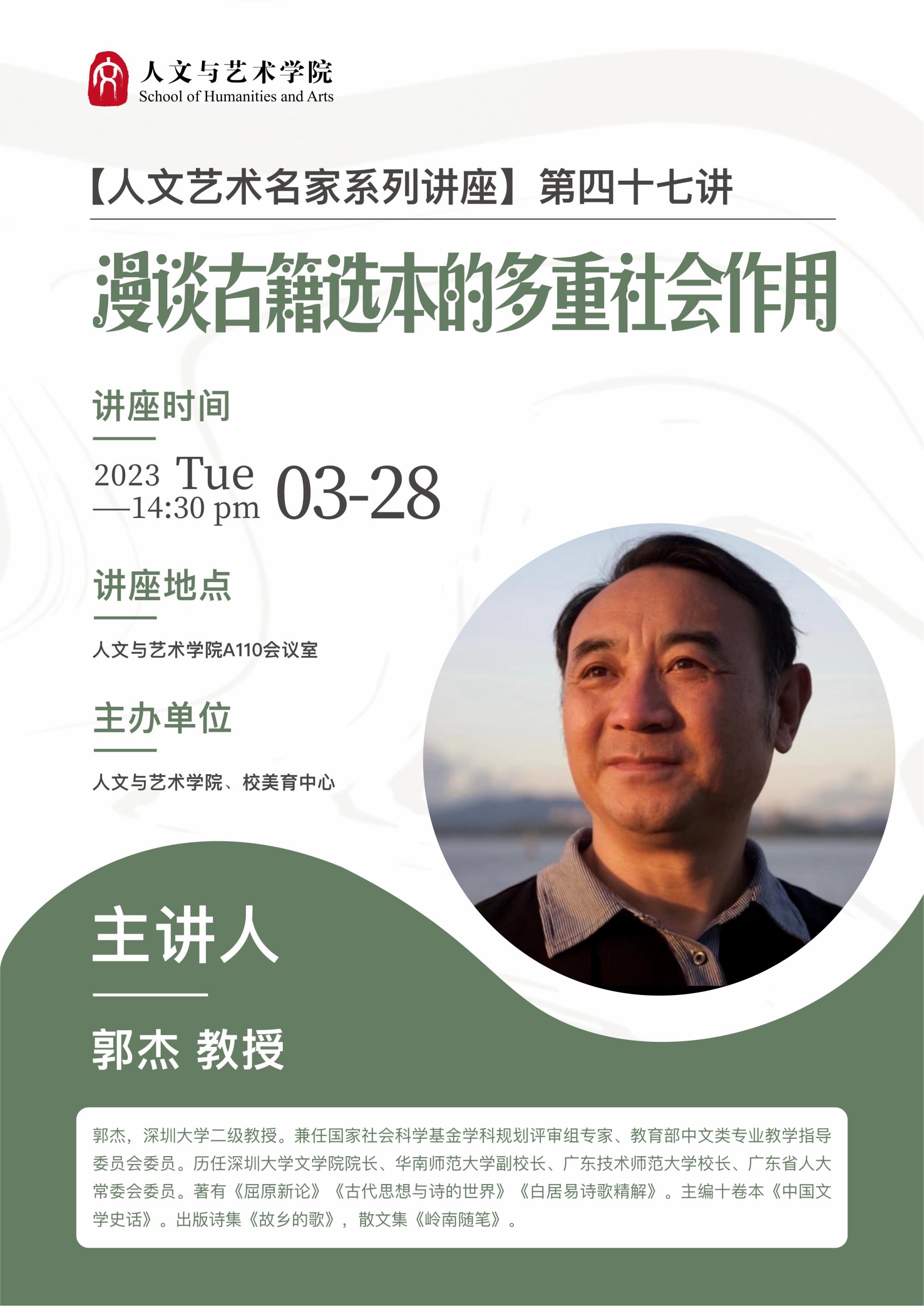 主讲人简介:郭杰,深圳大学二级教授。兼任国家社会科学基金学科规划评审组专家、教育部中文类专业教学指导委员会委员。历任深圳大学文学院院长、华南师范大学副校长、广东技术师范大学校长、广东省人大常委会委员。著有《屈原新论》《古代思想与诗的世界》《白居易诗歌精解》。主编十卷本《中国文学史话》。出版诗集《故乡的歌》,散文集《岭南随笔》。