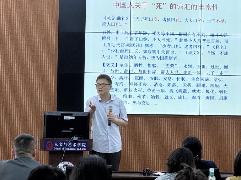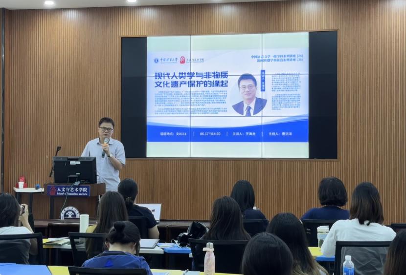 王海龙首先从联合国教科文组织《保护非物质文化遗产公约》的制定实施过程展开,详细阐述了非物质文化遗产背后所隐藏的民俗、仪式、信仰、理念和价值等,重点介绍了非物质文化遗产的五种重要表现形态。随后,他结合“文艺复兴及博物学兴起”这个话题,以当时西方从流行“东方主义”“中国热”到对中国持仇视、污蔑态度的转变为例,指出,当前文化人类学、比较文化学等研究范式主张世界文明多样性和不对任何文明进行价值判断,引导大家思考人类学未来的发展愿景。他还从“博物馆兴起与文化救险运动”切入,结合当前世界上多种语言面临着消亡的现实困境,阐释了对于非物质文化遗产进行抢救性保护的重要意义。最后,他以原始部族的结绳记事、玛雅文明的文字等人类学调查资料和中西方语言表达的词汇丰富性为例,介绍了认知语言学的研究意义。
