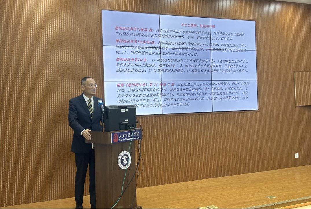 刘晓海教授系统梳理了中国《劳动合同法》及相关司法解释对竞业限制的规定,详细解释其适用对象、限制期限和补偿方式等内容。刘晓海教授指出,竞业限制的范围、地域和期限需与劳动者接触的商业秘密相适应,超出合理范围的部分可能被认定为无效。刘晓海教授从比较法层面介绍了德国《商法典》与瑞士《债法》的相关制度,探讨了违约金设置、补偿金支付、协议解除等实务问题,并厘清了竞业限制与保密义务的区别与联系。在讲座互动环节中,刘晓海教授为学子们答疑解惑并勉励学子们深耕学习。
