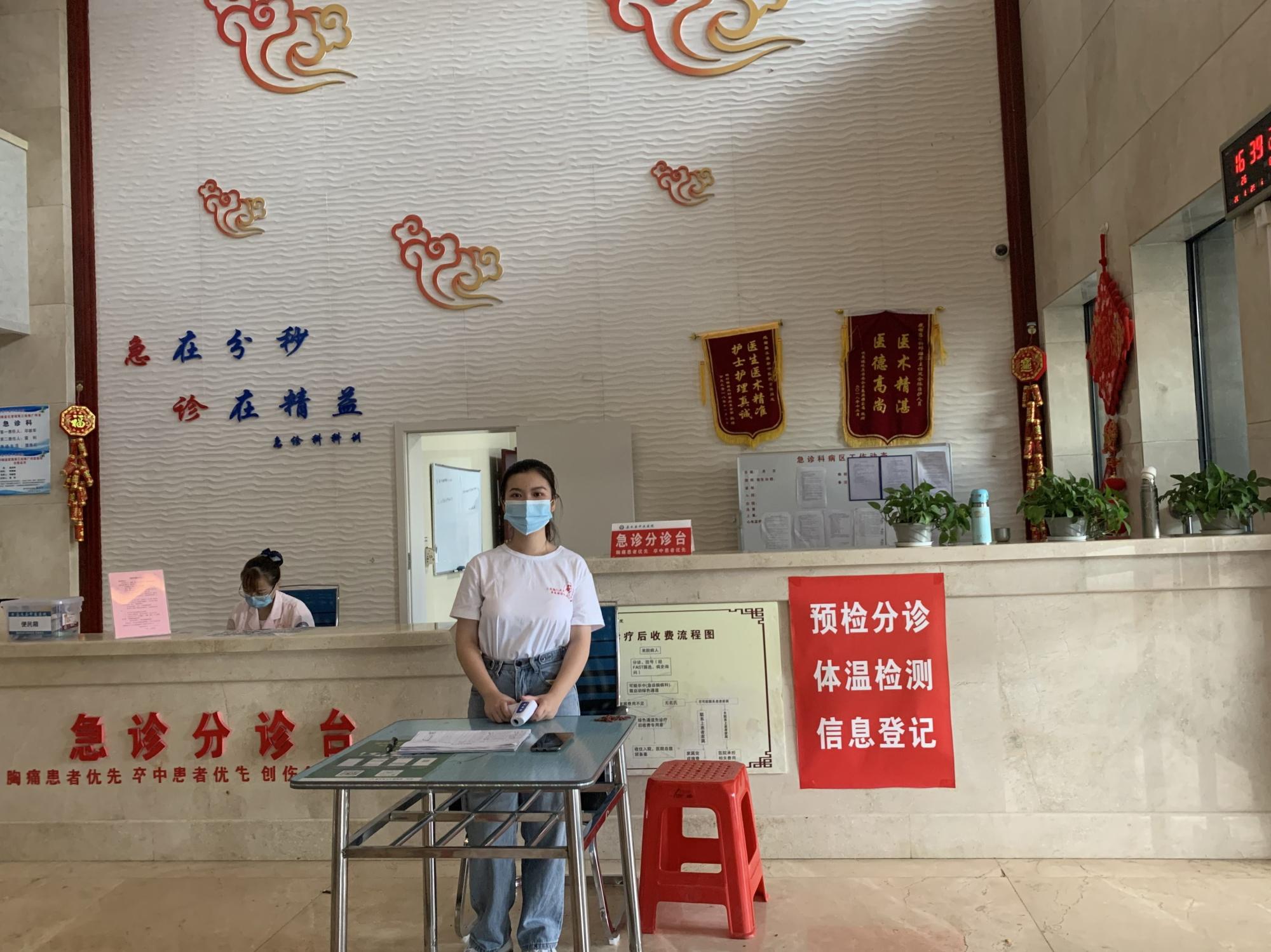 8月26日下午3时,“同心战疫,同屏共振”社会实践团队成员雷涵淇前往湖南省嘉禾县中医院进行测温站岗志愿活动。