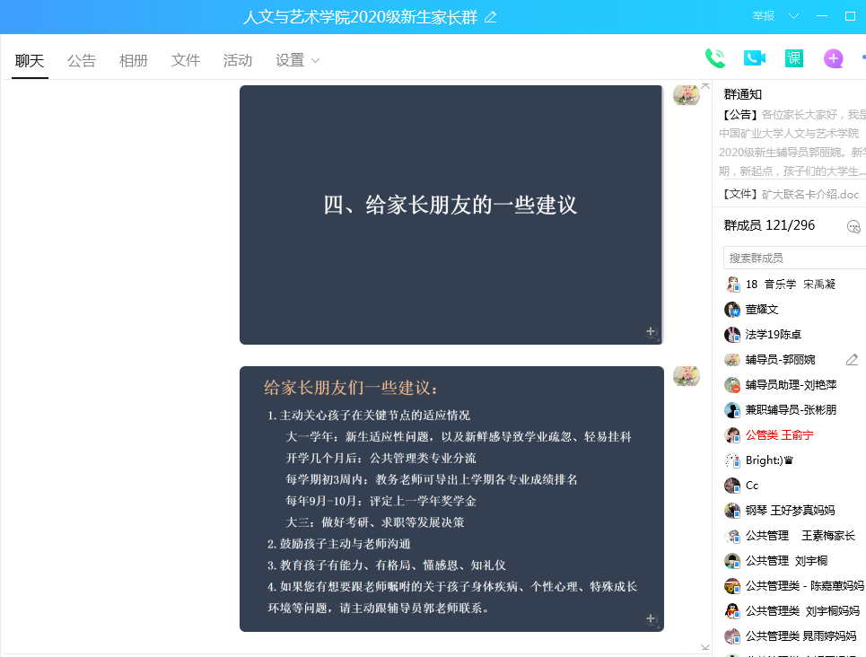 始终重视构建家校良好融合,携手共育学生,在新生招录完成后便建立了2020级新生家长QQ群。本次新生家长会的召开让家校融合在新生入学伊始便有了热度,是将新生入学教育提前至入学前、延伸至家庭,也具体显现了学院坚持立德树人,落实全过程育人、全方位育人的宗旨。