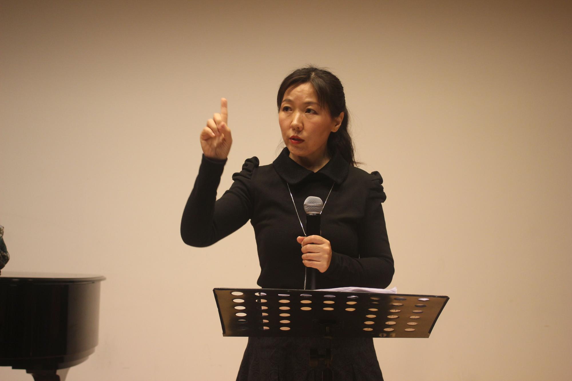 特邀音乐系副教授朱文老师前往艺术报告厅指导新生合唱。朱文老师毕业于南京师范大学音乐学院,作为中国音乐家协会会员、中国合唱联盟会员、中国高校合唱协会会员,她辅导学生参加全国、省、市钢琴比赛多次获奖,在合唱领域造诣颇高。