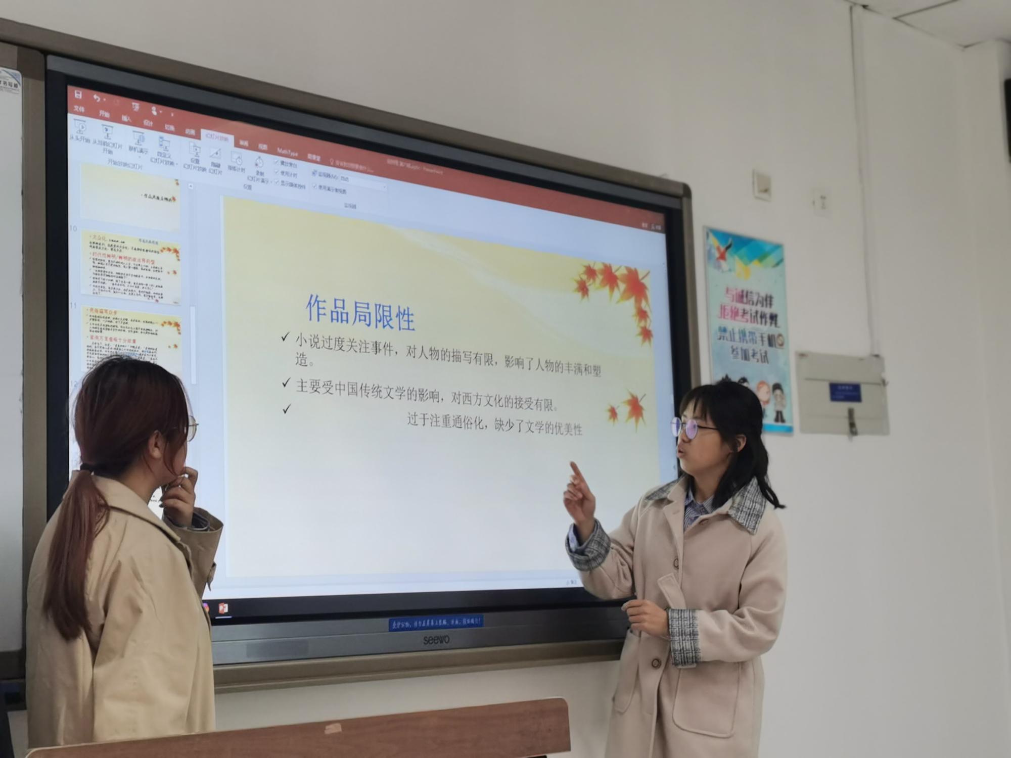 本次活动以分组讲解文学名家的形式开展。首先,刘振乾介绍人民艺术家老舍,结合生平经历,分别介绍他的长篇小说、中短篇小说和话剧,重点讲解了老舍的“京味”风格及“贵浅显”“戒浮泛”“重机趣”的语言风格。其次,刘雅凡介绍解放区文学的代表赵树理,重点分析作品中的民俗描写、晋南方言的使用及评书体的现代小说形式。接着,申乙冉介绍张爱玲的成长经历,许若轩和霍彦睿分析其《半生缘》叙事写法的得失。最后,冯仰操老师对同学们的讲解的优点作出表扬,提出讲解应兼顾深度与广度、提炼整体特点等值得改进之处,并与同学们共同交流探讨。此外,本次活动中同学们还分组讨论交流了茅盾、巴金、沈从文等文学名家。