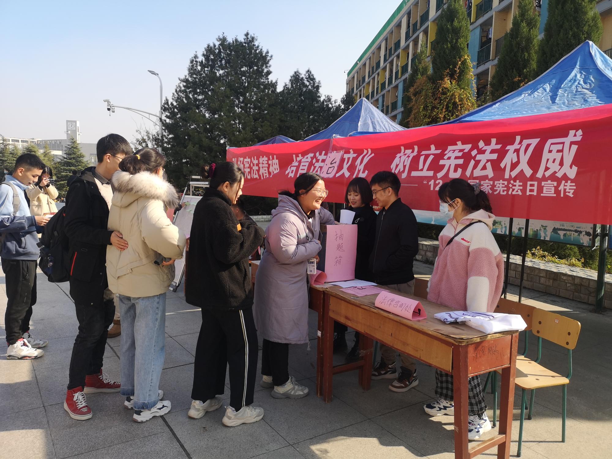 二食堂广场集合,排列好队形,开始朗读宪法法条。清晨广场的朗朗书声吸引了许多路过的同学们,不仅让同学们了解了宪法知识,同时在校园营造了浓厚的宪法日氛围。