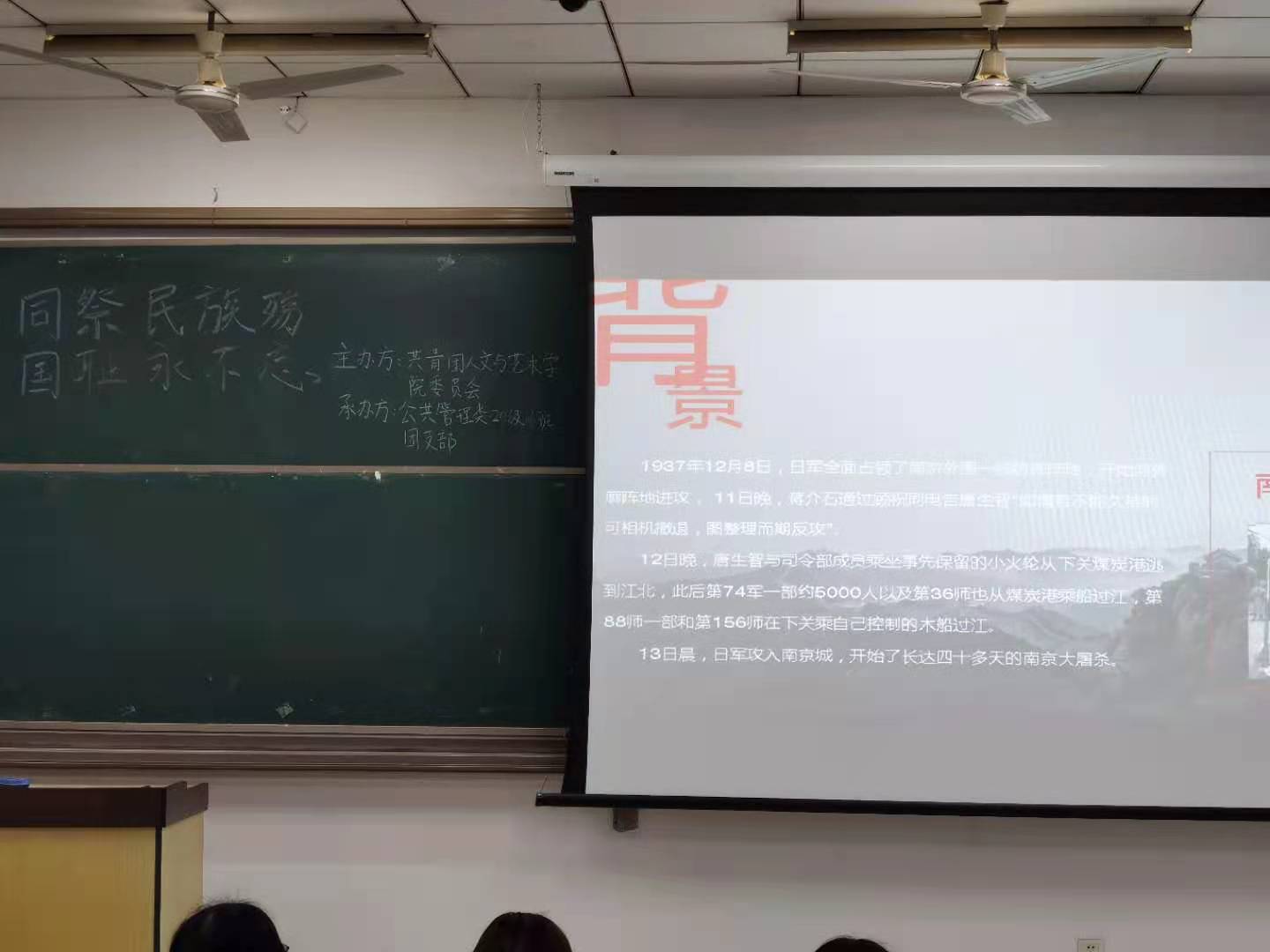 会议伊始,团支书王莘童同学首先向我们讲解了南京大屠杀发生的历史背景与史实,向我们展示了那段悲伤的岁月,然后几位同学分享了自己的观看感悟。之后全体同学共同观看了南京大屠杀纪念视频,以别样的角度向我们展示了那段心痛的岁月。