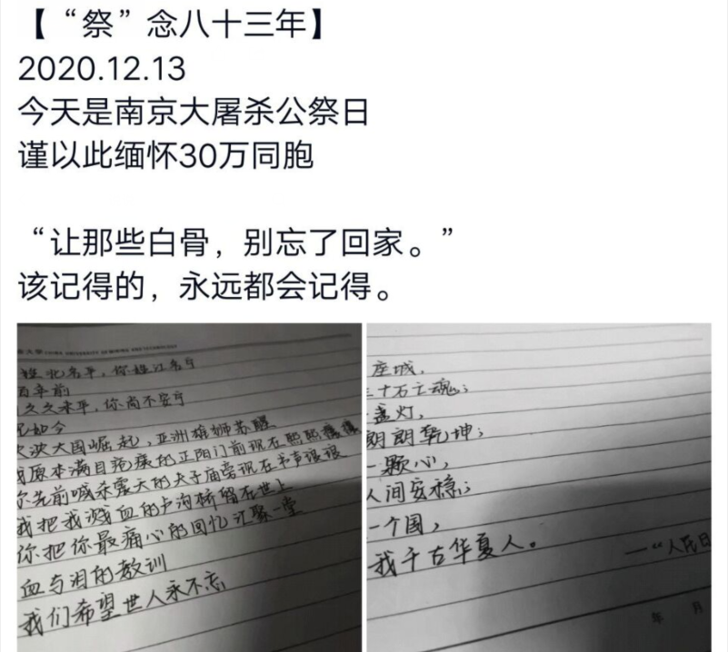 12月10晚,承办部门公益部安排相关人员进行扫楼宣传,并邀请同学进入活动群,在同学们了解活动性质与活动细则后,报名参与的志愿者们便依据活动安排开始进行相关的作品制作。志愿者们踊跃报名,创作热情十分高涨。12月13日,志愿者纷纷提交了纪念南京大屠杀八十三周年的诗歌、绘画、手工制品等“祭”念作品,经公益部审核后在无码av