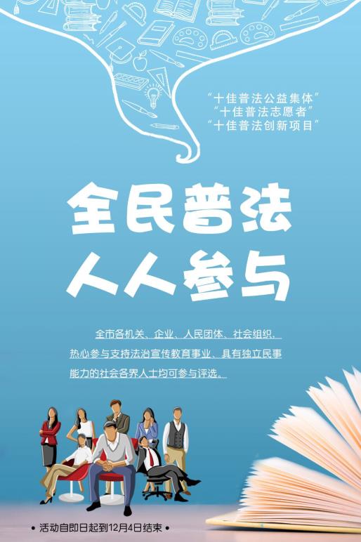 据了解,本次评选活动以“全民普法,人人参与”为主题,全市各机关、企业、人民团体、社会组织,热心参与支持法治宣传教育事业、具有独立民事能力的社会各界人士均可参与评选。活动旨在推选出一批具有代表性、示范性的好团队、好组织、好故事,通过加强典型宣传,形成示范效应,引导和激励各类组织、群体更加主动地投入到普法实践中,促进普法力量不断壮大。