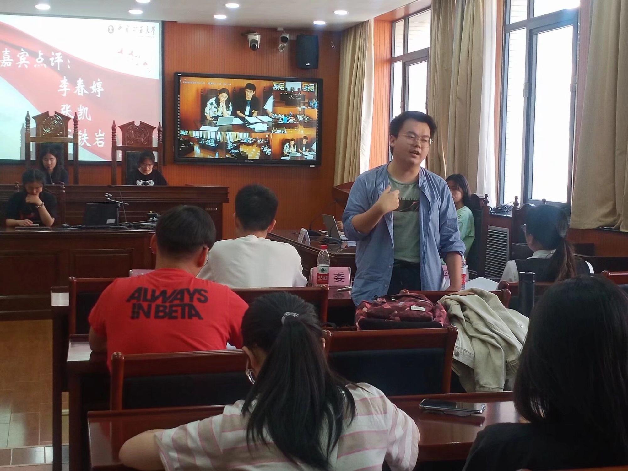首先书记员核对当事人情况,进入法庭调查环节,原告、被告代理人轮流诉辩。审判员根据双方诉辩意见,总结双方争议焦点。接着进入质证阶段,原被告代理人分别质证举证。其次是法庭辩论环节,原告、被告围绕争议焦点分别发表辩论意见。最后是法庭调解环节,双方提出调解方案。在书记员宣布退庭后,李春婷、张凯、冯铁岩三位17级的优秀学长学姐对表演赛进行点评。学长学姐提出双方同学的可圈可点之处的同时,也点出其中的不足之处。