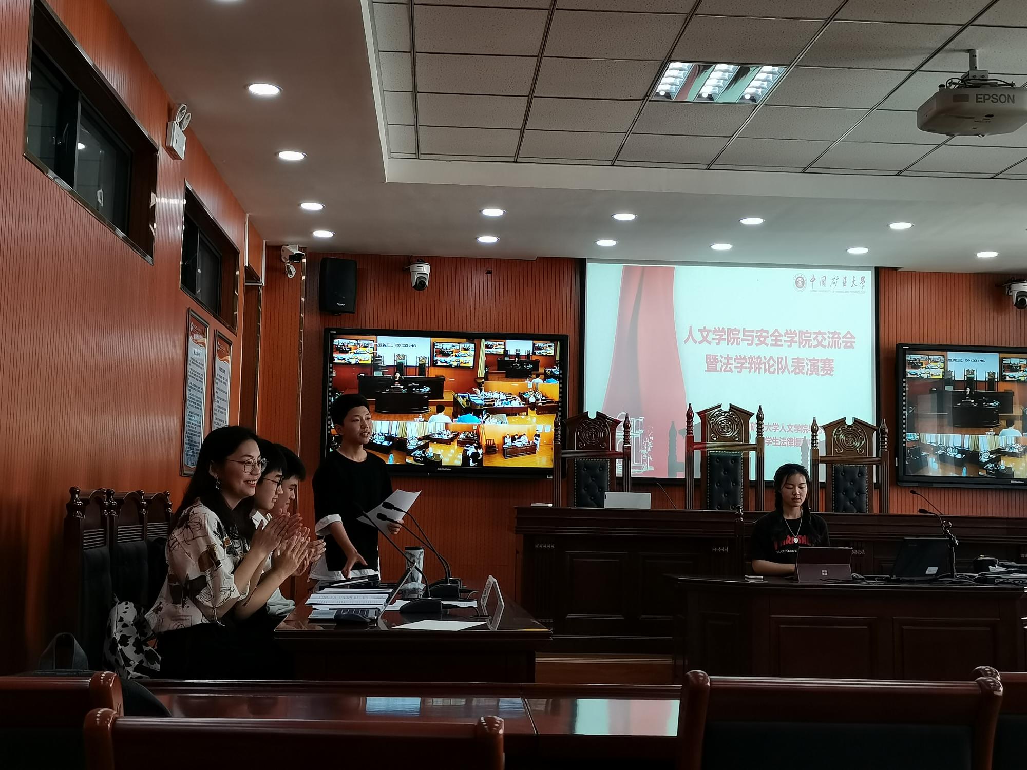 大学生法律援助中心于文科楼416室模拟法庭举办了人文学院与安全学院交流会,法学辩论队就“周学正诉郭书彦、黄兰芳、博艺公司借款纠纷”一案开展表演赛。