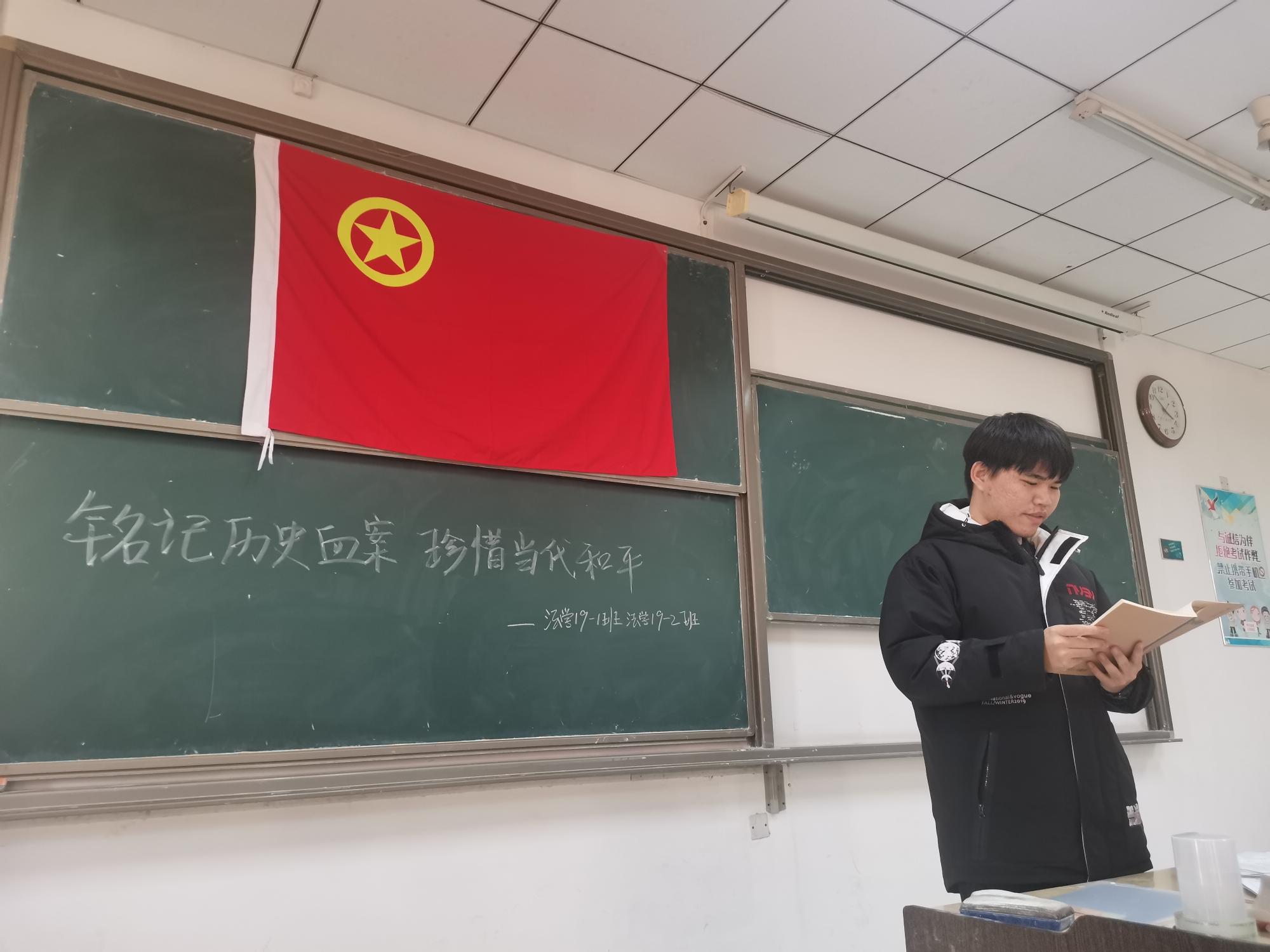 首先,团支书肖瀚峤同学为我们介绍了南京大屠杀历史,阐述了此次团日活动的意义。他说到,今年的12月13日,是南京大屠杀84周年纪念日,是第八个南京大屠杀死难者国家公祭日,同祭民族殇,国耻不忘。随后,同学们围绕铭记历史,勿忘国耻这一主题进行发言。赵庆哲同学说到:南京大屠杀惨案铁证如山、不容篡改,忘记历史就意味着背叛,否认罪责就意味着重犯。尹逊豪同学说则说到:“国恨家仇祭笛鸣,潜藏悲怒动心怦。雄狮已跃山峰顶,不报倭顽愤不平。”谢梦涵同学说:“中国人民抗日战争的胜利,谱写了中华民族不屈不挠抵抗外来侵略的壮丽史诗,历史不会因时代变迁而改变,事实也不会因巧舌抵赖而消失。”马雅琪同学最后说到:“雨花泣血色犹寒,卅万亡魂碑未干。长使钟鸣天地彻,弯弓射日铸诗澜。”活动最后肖瀚峤同学对本次活动作出最后总结,此次活动顺利结束。