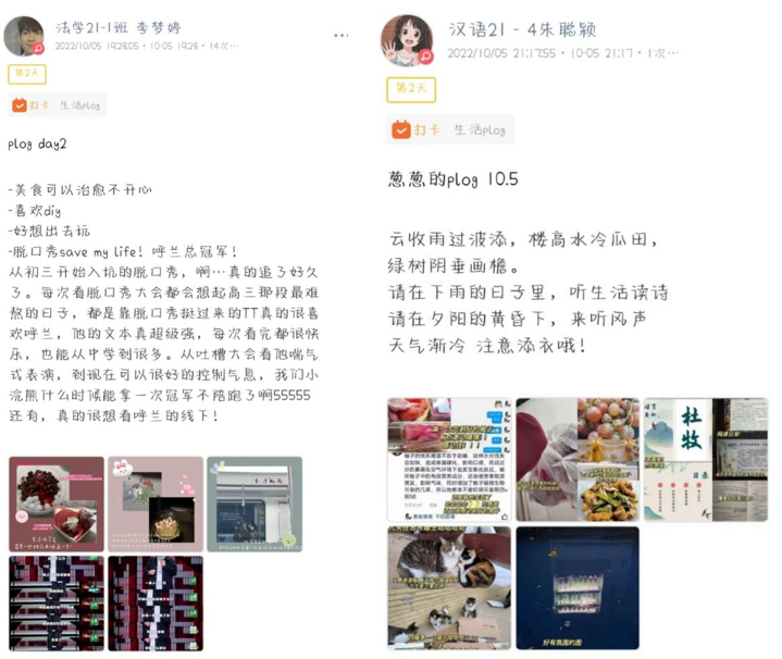活动举办以来,同学们踊跃报名,积极参与,以plog打卡的方式展示自己的日常生活。他们将尝到美食时的满足、受到称赞时的喜悦以及对自然风光的独特体验以图文结合的形式记录下来,一条条分享的背后是一个个闪闪发光的时刻,是疫情也无法淹没的浪漫和热情。后期,工作人员将整理活动照片,收集各位同学对本次活动的反馈,撰写活动总结,并通过学院公众号推文对活动成果进行展示。
