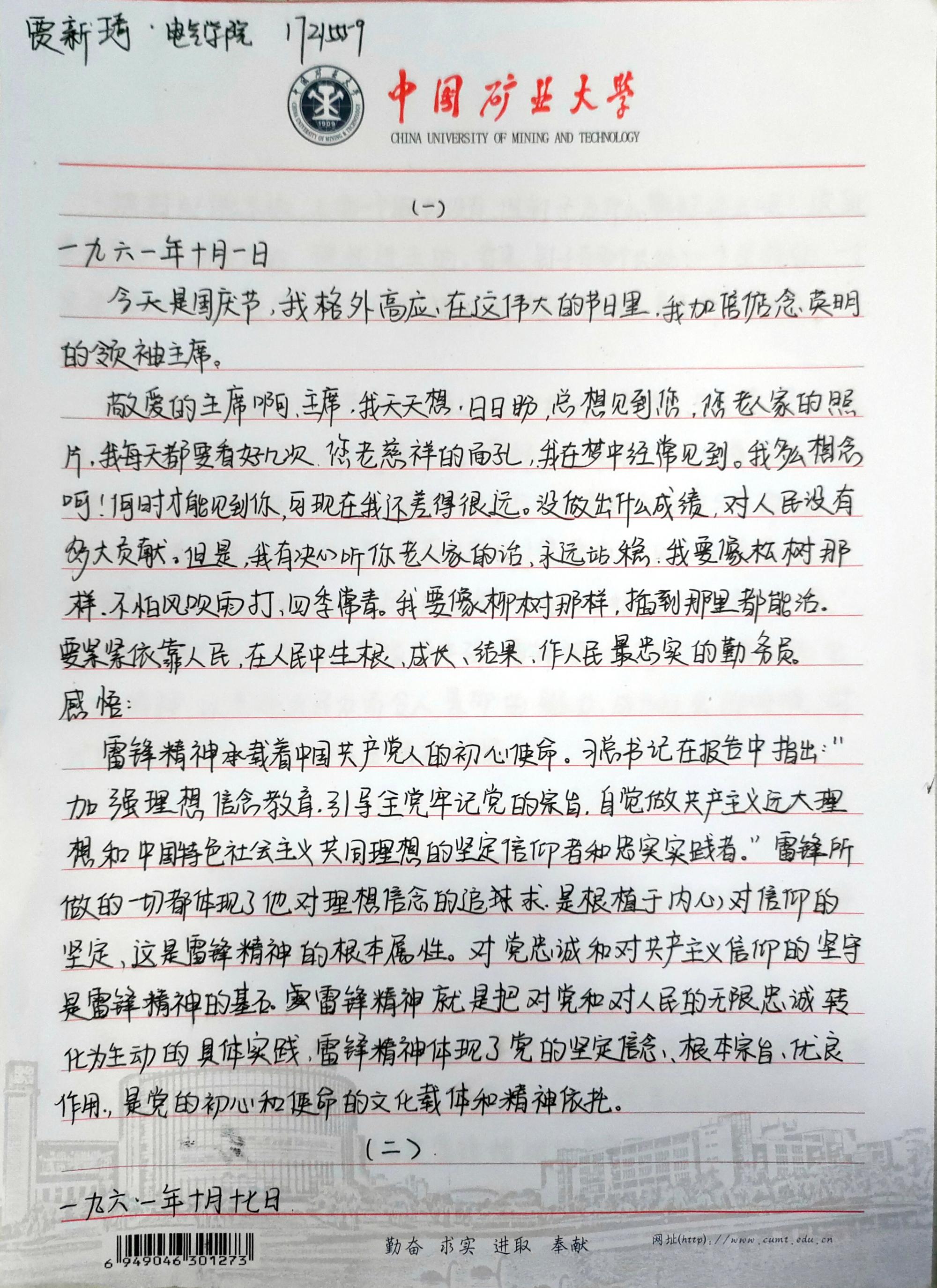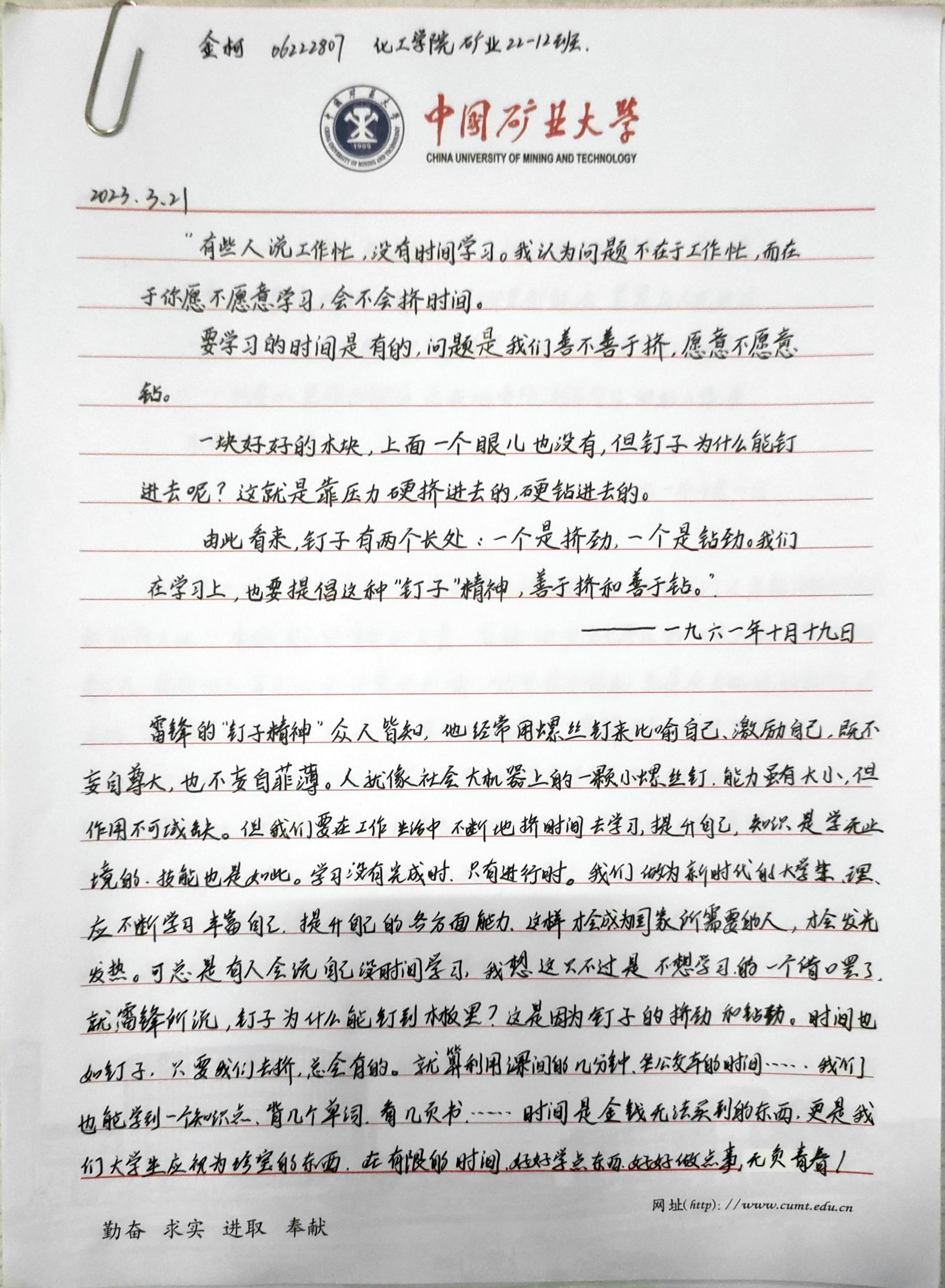 3月9日至3月21日,志愿者们自主阅读《雷锋日记》,在阅读过程中做好文段摘抄工作,并附上联想感悟。此次活动期间,志愿者们品读书中《火车上的好人好事》《如果你是一滴水》等作品,从中了解了雷锋一生中所做的好事,感受到雷锋个人思想与人格魅力;同时,通过摘抄妙语佳句、记录阅读感悟,志愿者们于无形中加深了对雷锋精神的感受,并自然地将这种精神与自身的实际生活、实践行为相联系,更好地将“雷锋精神”内化于心、外化于行。