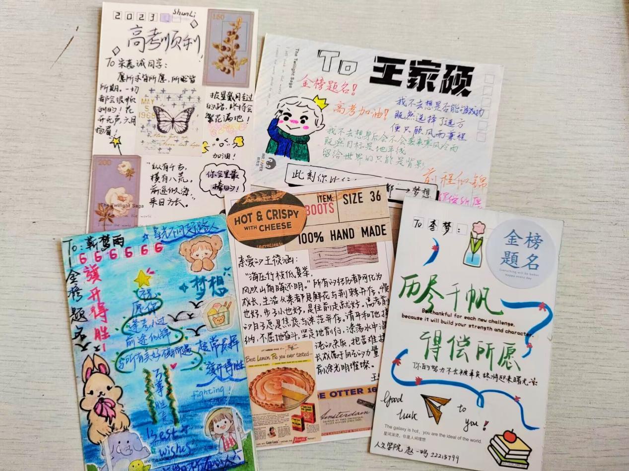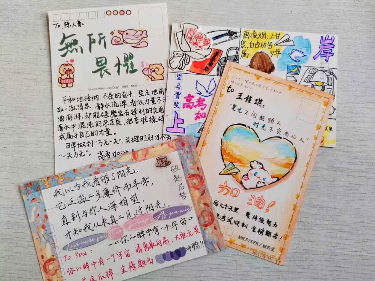 活动伊始,部门负责人将学子的信息和空白明信片进行分配,志愿者领取后在明信片上书写绘画,将自己的“考试秘籍”倾囊相授,或慷慨激昂、或幽默睿智、或温馨感人。“海压竹枝低复举,风吹山角晦还明。”“纵有千古,横有八方,前途似海,来日方长。”“画凌烟,上甘泉,自古功名属少年。”“星光不问赶路人,时光不负有心人。”志愿者们用心写下一句句,表达了对高三学子的真诚祝福。20日,志愿者上交了精心制作的明信片,每一张明信片上标注着一位学子的姓名。