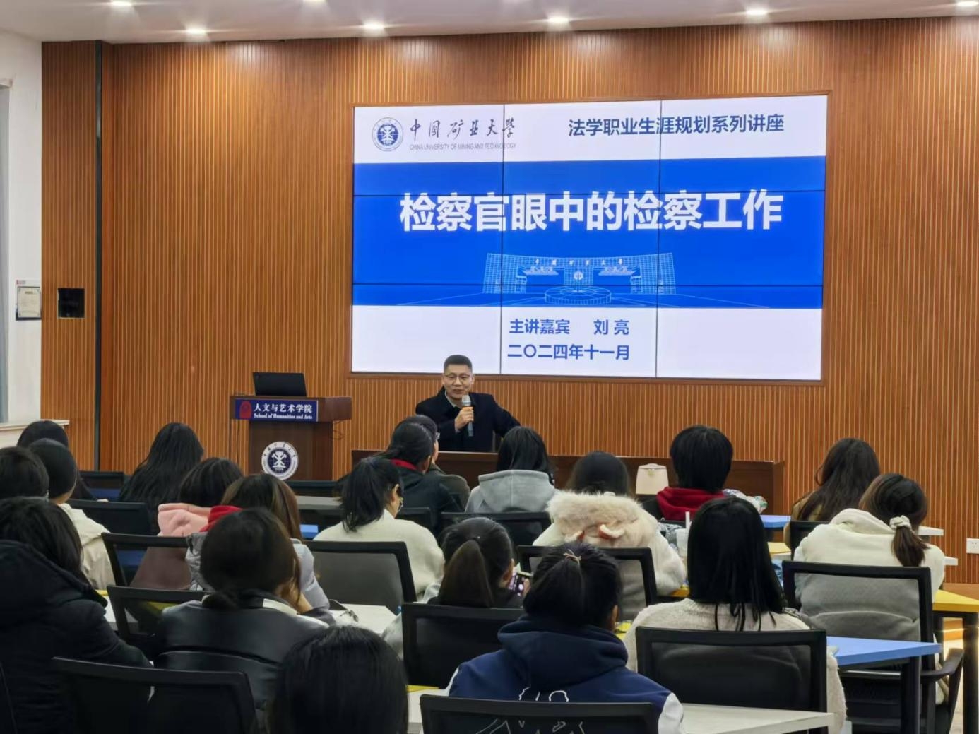 A111会议室举办。我校法学本科2004级校友、全国民事检察人才库成员、全省检察业务专家、全省民事行政检察业务标兵、徐州市人民检察院第六检察部主任、检察委员会委员刘亮受邀作“检察官眼中的检察工作”主题讲座。刘亮结合自身工作经历,为大家详尽分析了检察院在司法体系中的定位与职能,解释了检察院内部职务分配与检察官的日常工作。随后针对同学们关注的检察官入职要求等问题进行一一解答。他提醒同学们要明确学习目标并且及时调整,向着目标不断锤炼自身、厚积自我、静候时机。讲座现场反响热烈,同学们纷纷表示受益匪浅。