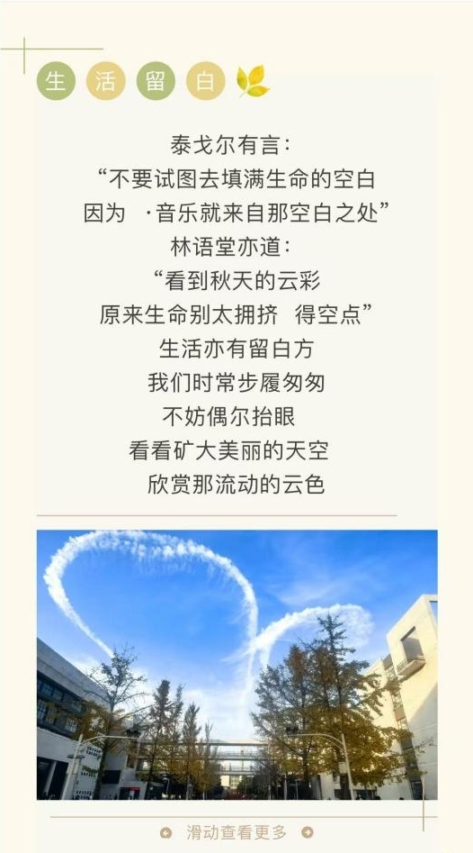 活动期间,同学们纷纷发挥创意,从日常生活中汲取灵感,将那些看似平凡却又充满意义的瞬间转化为文字,通过推文的形式展现出来,大家在日常生活中寻找美好,用文字记录下那些值得珍藏的瞬间。参赛者们提交的推文主题丰富,包含丰盈的高中岁月、饱含韵味的矿大秋日、与朋友相处的点滴瞬间等。作品不仅展现了同学们敏锐的观察力和细腻的感知力,更通过留白的手法,让读者在阅读过程中产生共鸣,感受到生活中的美好与温暖。