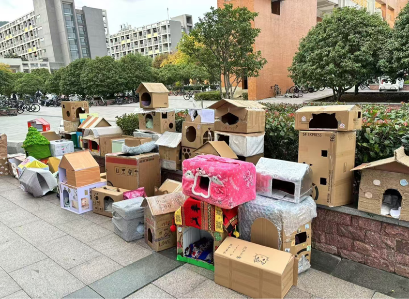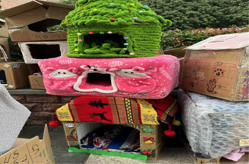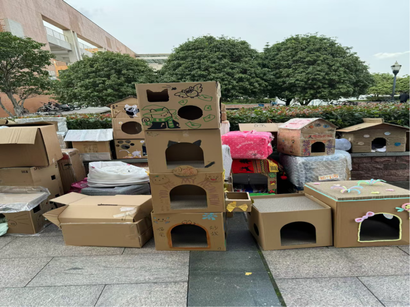 参与者将清洗后的旧衣物或环保材料作为原料,将低碳环保的绿色理念融入到自己巧妙的构思当中,为学校的流浪猫制作猫窝,实现旧物二次利用。同学们制作的猫窝兼具美观与实用性,为小猫提供了安稳舒适的过冬避风港。随后,活动主办方收取旧衣物和猫窝,完成登记、评分和整理工作。同时,主办方组织进行猫窝义卖活动,收取的旧衣物以及义卖所得资金皆用以支持红叶流浪动物救助基地运行,以救助更多的流浪动物。