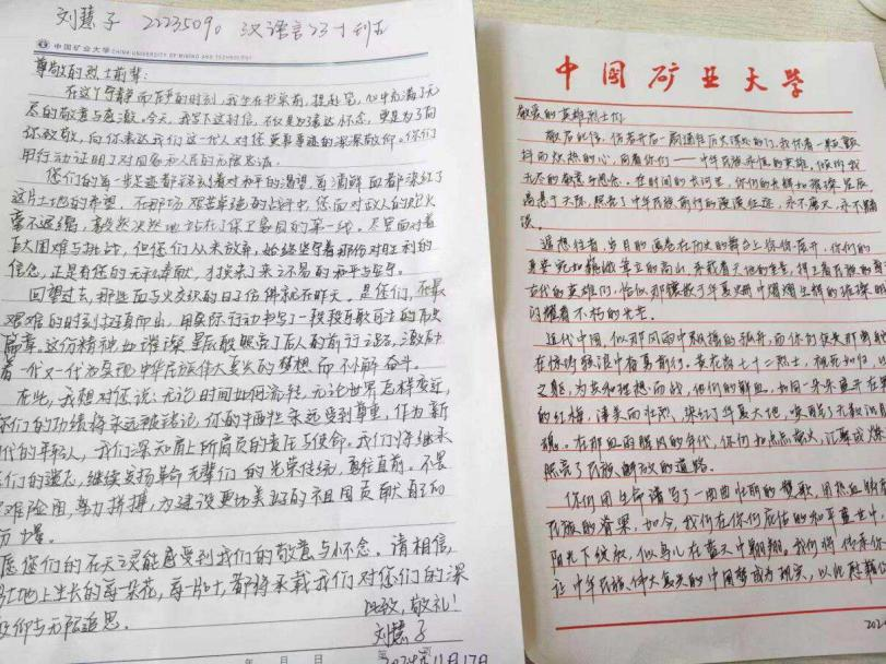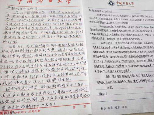 人文学子以信件抒写缅怀情感,传达来自青年人的追思。信件中,同学们以当代大学生视角追忆淮海战役,细述革命先烈的峥嵘往事,真切抒写敬仰情思,表达对祖国与民族的热爱。信件书写完毕后,志愿者在竹苑一号楼下统一收取并整理,将优秀作品送往淮海战役纪念馆展示。