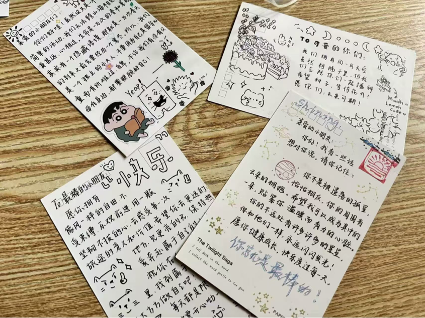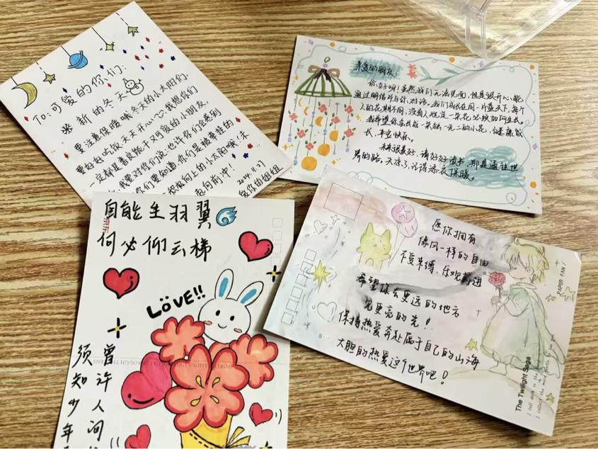 同学们通过设计明信片为留守儿童送上自己的祝福与关怀。在明信片上,参与者们绘制了精美可爱的图案,并为文字标注拼音、勾画花边,以便于孩子们的理解。活动负责人收集明信片,完成作品评定。明信片被统一寄往江苏省徐州市史庄小学、江苏省徐州市邳州市邳城镇大庙小学、江西萍乡莲花县路口镇小学。