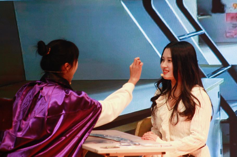 《癞蛤蟆想吃天鹅肉》讲述了男大学生在虚假情感诱导下陷入刷礼骗局、险遭财产损失的故事。同学们真实细腻的表演展现了诈骗话术与受害者的心理转变过程。《恋爱脑历劫》则呈现了学生因轻信塔罗占卜、被以“改运”为名骗取钱财的情节。同学们生动的演绎赢得了全场阵阵掌声,也在潜移默化中加深了大家对诈骗手段的识别能力。