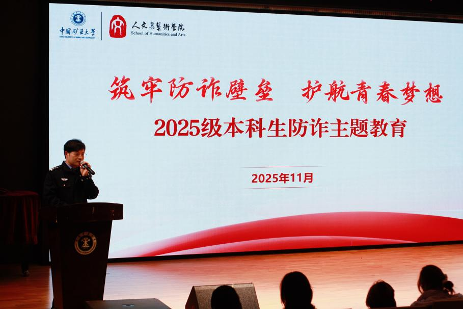 在学术报告厅开展防诈教育主题活动。学院副院长刘振出席,徐州南站派出所副所长祁中誉担任主讲,学院2025级全体本科生参与。活动由2025级专职辅导员程金松主持。