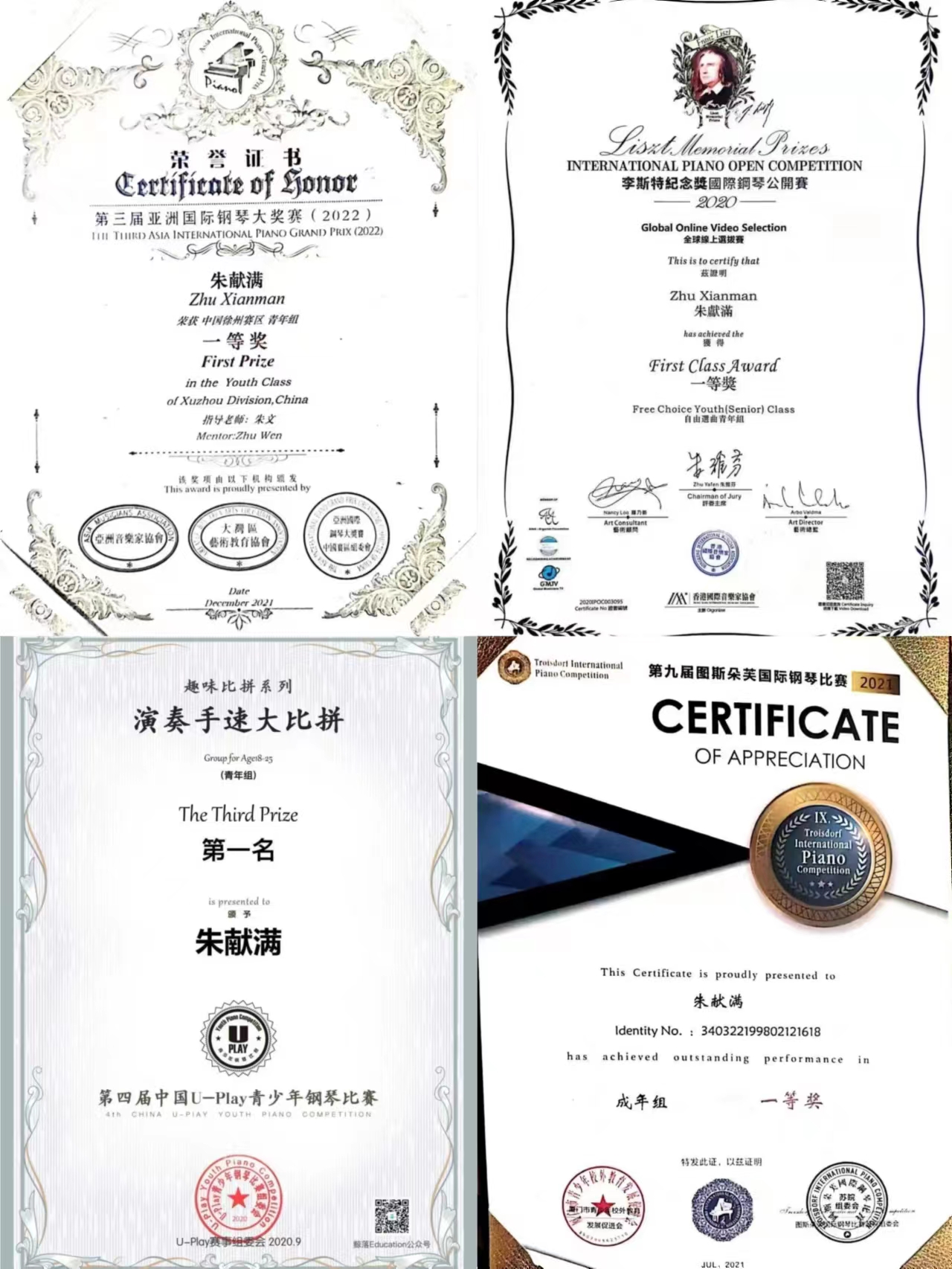 朱献满,音乐学专业2019级本科生,保研至东北大学。曾获得国家奖学金,校级一等奖学金,校级优秀学生,校级优秀共青团员等荣誉,在20余次省市级钢琴比赛中获得优异成绩。