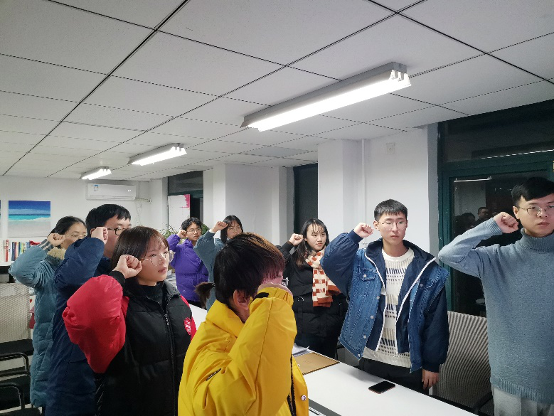 会议结束后,李玉雪老师谈到作为学生党员应时刻牢记身份,她强调大家在日常生活中要发挥枢纽和沟通作用,对于身边同学日常遇到的难题要积极地进行回应,在临近毕业的这一个学年中履行好为同学服务的职责。最后,由张文玥同学领誓,全体党员在党旗之下重温入党誓词,庄严地进行宣誓。