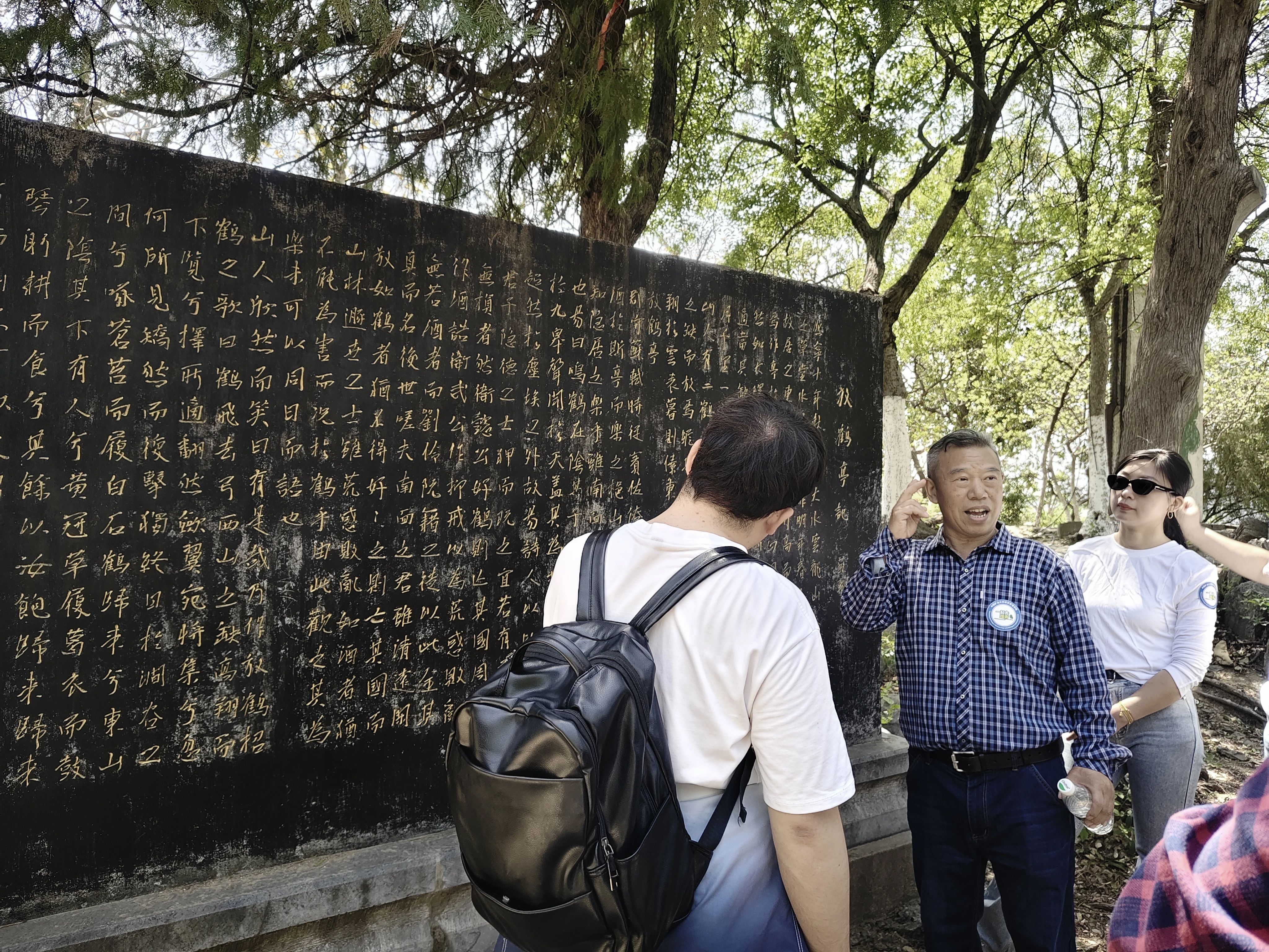 活动的最后一处景点是位于云龙山上的放鹤亭。在风雨侵蚀下,牌匾上的“放鹤亭”字迹已渐斑驳,但石碑上镌刻的苏轼名篇《放鹤亭记》仍然清晰可见。管院长重点分析此文,指出文中描写了云龙山壮阔的景观,其中苏轼对飞鹤的羡慕之情,实际是他对自由适意生活的向往。苏轼思想兼容儒道,既有积极有为、勤政爱民的儒家一面,又向往闲适自由的隐居生活,在出世与入世的矛盾中展现思想的复杂与融通。因此,对苏轼在徐州时期精神的总结,大致可分为两个方面:积极进取的黄楼精神和清远闲放的放鹤情怀。